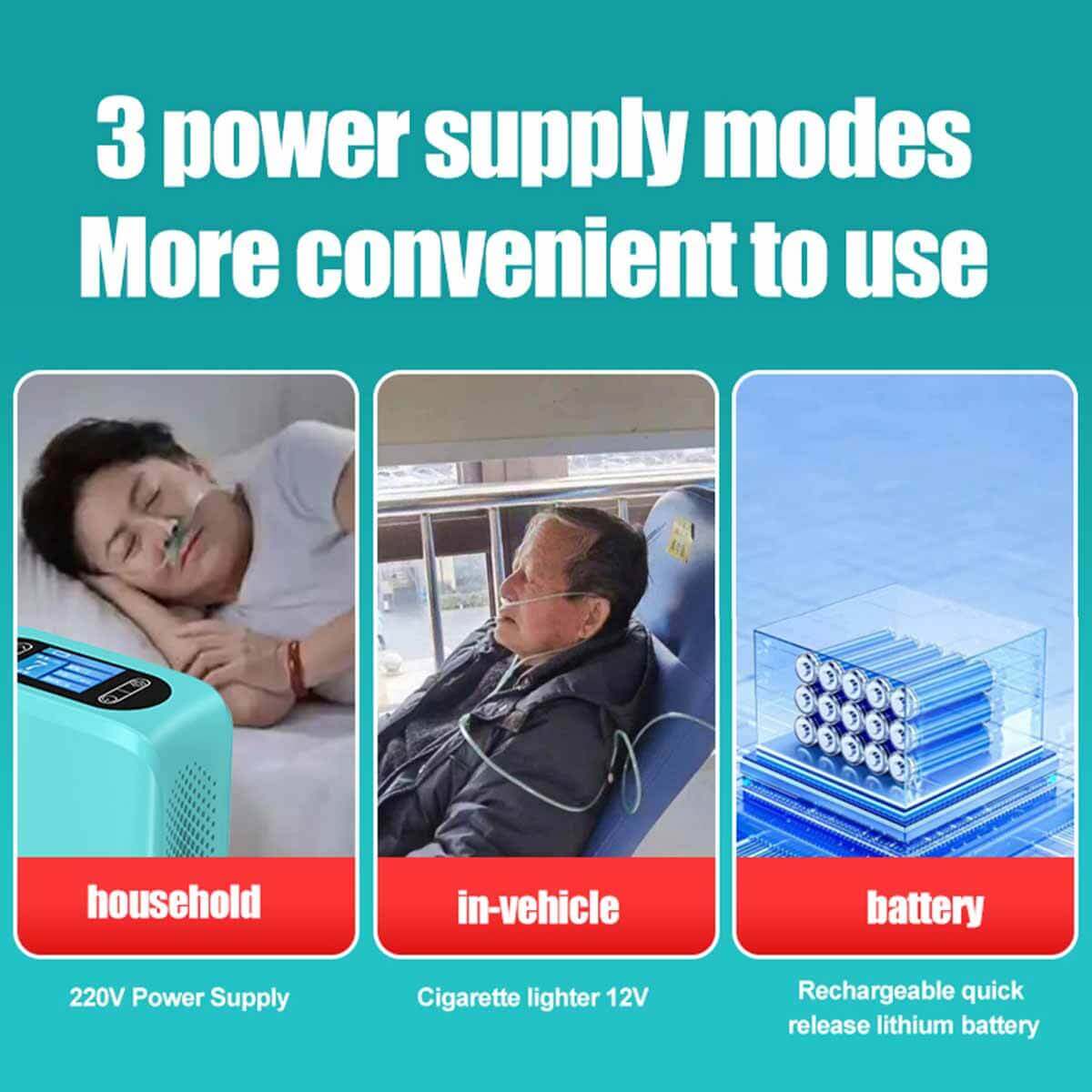 1. The oxygen concentrator is equipped with a rechargeable lithium battery, which can be removed and replaced to eliminate the risk of power outages.